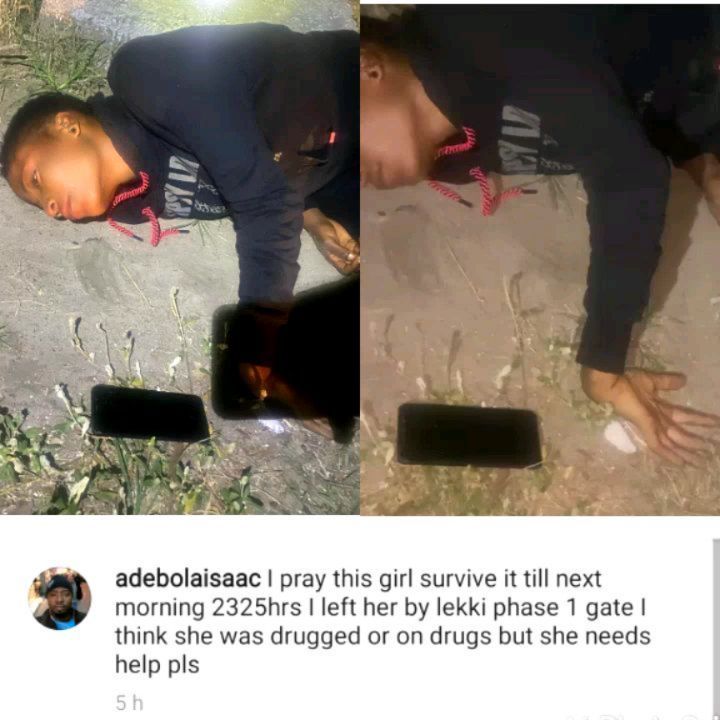 ”I pray this girl survive it till next morning 2325hrs I left her by lekki phase 1 gate I think she was drugged or on drugs but she needs help pls”