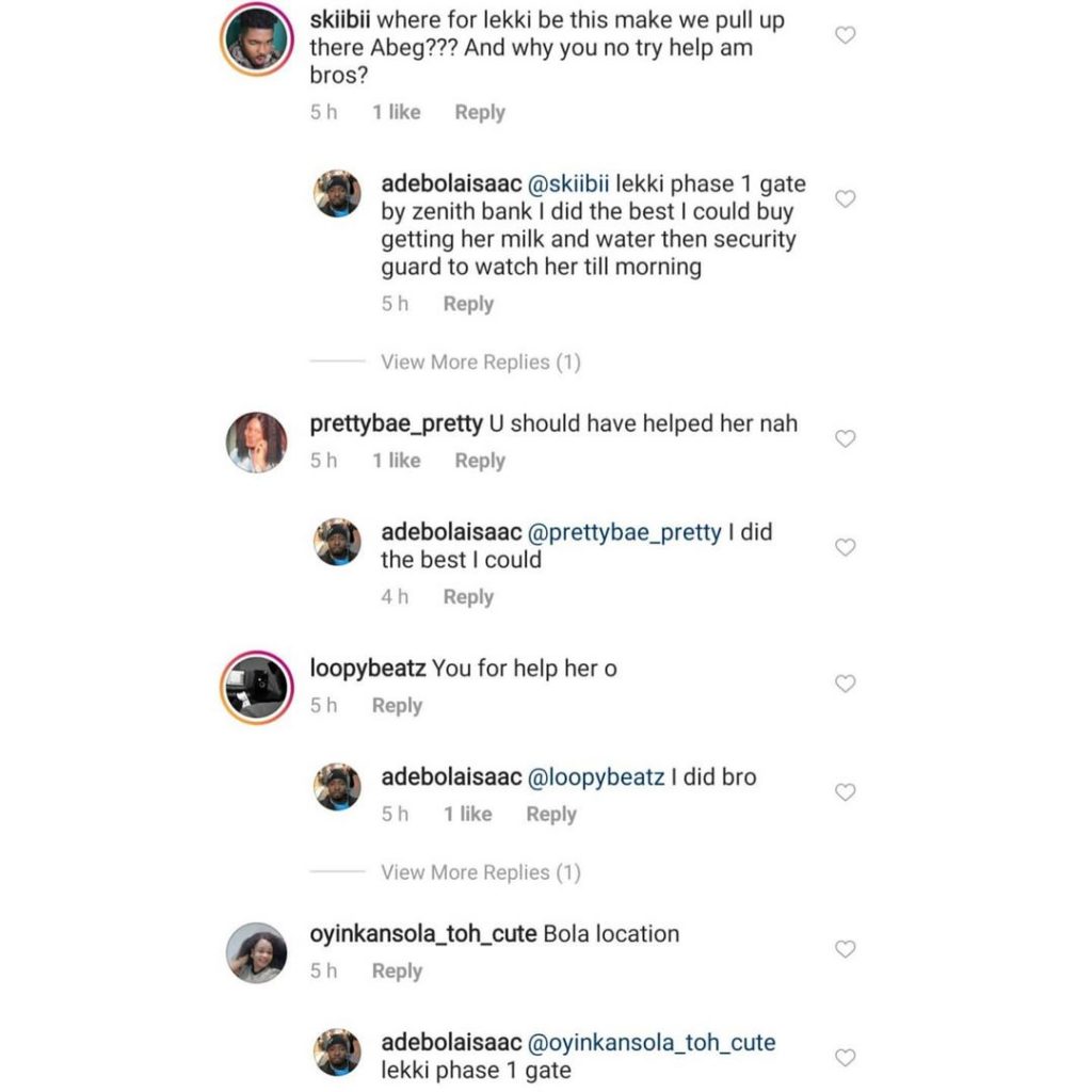 Isaac said he did his best by getting her milk and water and also asked the security guards in the area to watch over her till this morning.