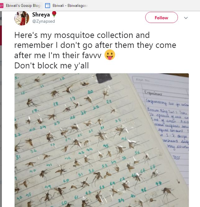 Is there Anything we won’t see on the Internet? Not Sure Lol.. Being Proud of her hardwork and Achievements a lady on Twitter has showed off a list of all the mosquitoes she has killed, she stamped them one after the other on a Book, and numbered them, Lol.. What a stress.