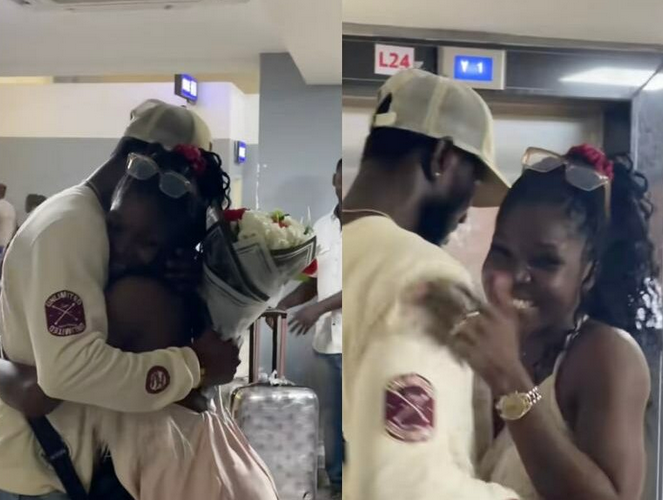 In the now-viral clip, she could be seen rushing into her husband’s arms, overwhelmed with excitement. Despite the lovey-dovey between the couple, the lady seemed a bit shy and at the same time joyous to finally set eyes on her man.