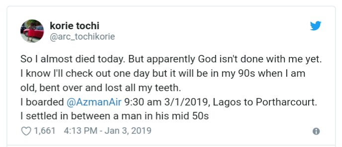 I boarded @AzmanAir 9:30 am 3/1/2019, Lagos to Portharcourt. I settled in between a man in his mid 50s