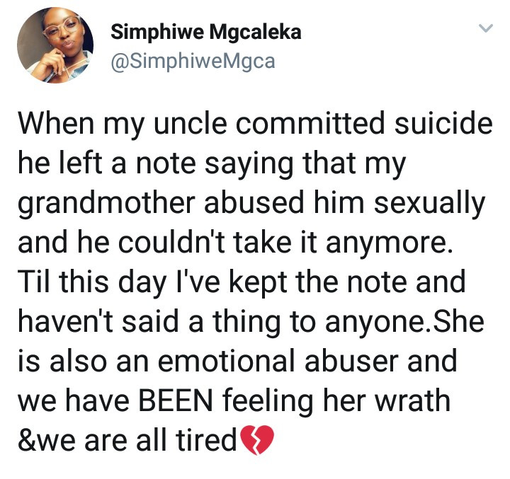 A lady has taken to Twitter to reveal that her uncle committed suicide and left a suicide note saying that his mother – the lady’s grandmother – sexually abused him. Now, the lady fears her grandmother might try the same thing with her brother.