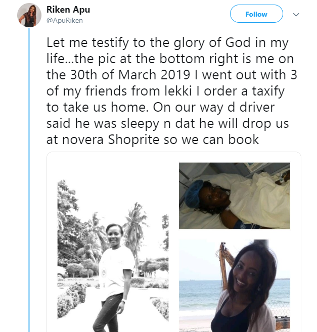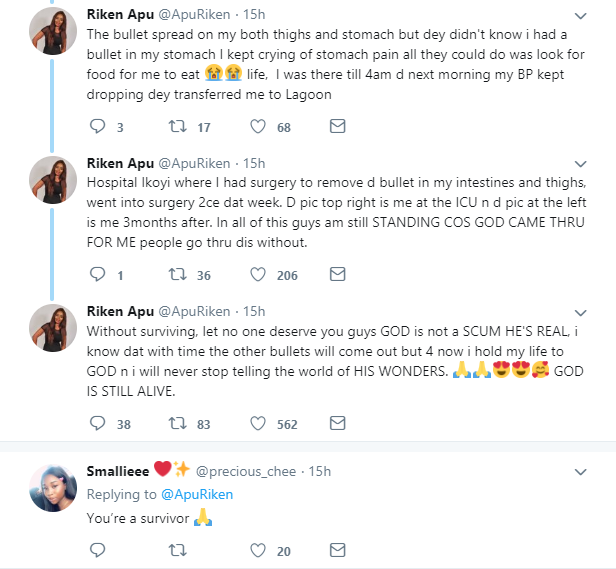 Three months after being shot at Lekki area of Lagos during an outing, Twitter user @ApuRiken is ready to tell her survival story.