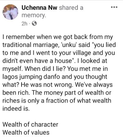 “You met me in lagos jumping danfo and you thought what? He was not wrong. We’ve always been rich. The money part of wealth or riches is only a fraction of what wealth indeed is. Wealth of character, Wealth of values