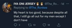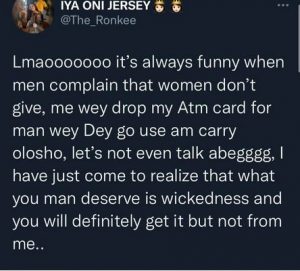 @The_Ronkee who was reacting to tweets on men complaining about women not gifting their partners, stated that men deserve wickedness but won’t get it from her.