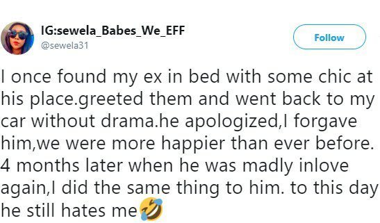 “I once found my ex in bed with some chic at his place.greeted them and went back to my car without drama.he apologized,I forgave him,we were more happier than ever before. 4 months later when he was madly inlove again,I did the same thing to him. to this day he still hates me”