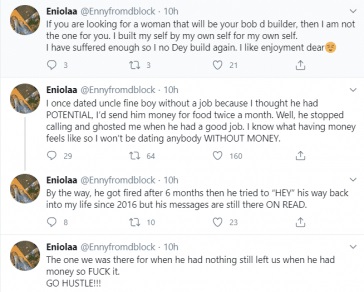 A Nigerian lady identified as Eniola has vowed never to date a broke guy again.