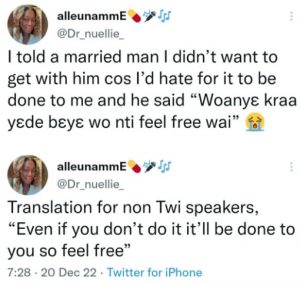 The lady said she told the married man that she didn’t want to be with him because she would hate it if someone else does same with her man.