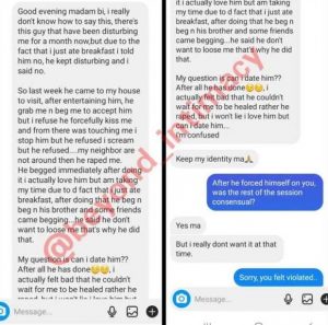 “A lady took to social media to seek advice on if she can date a man who forcefully had carnal knowledge of her during their talking stage.