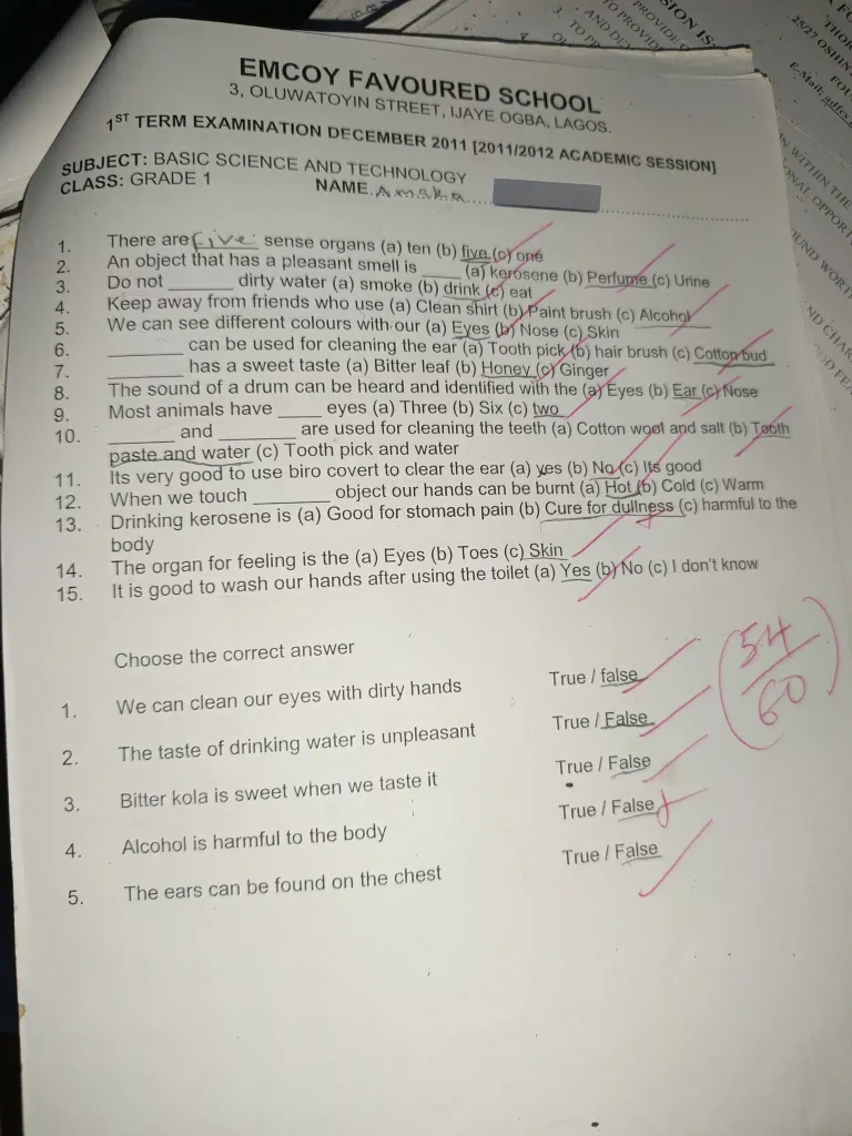 In question 14, she was asked which organ is used for smelling and chose skin from the options.