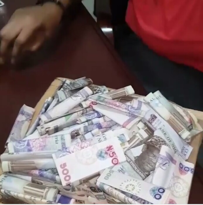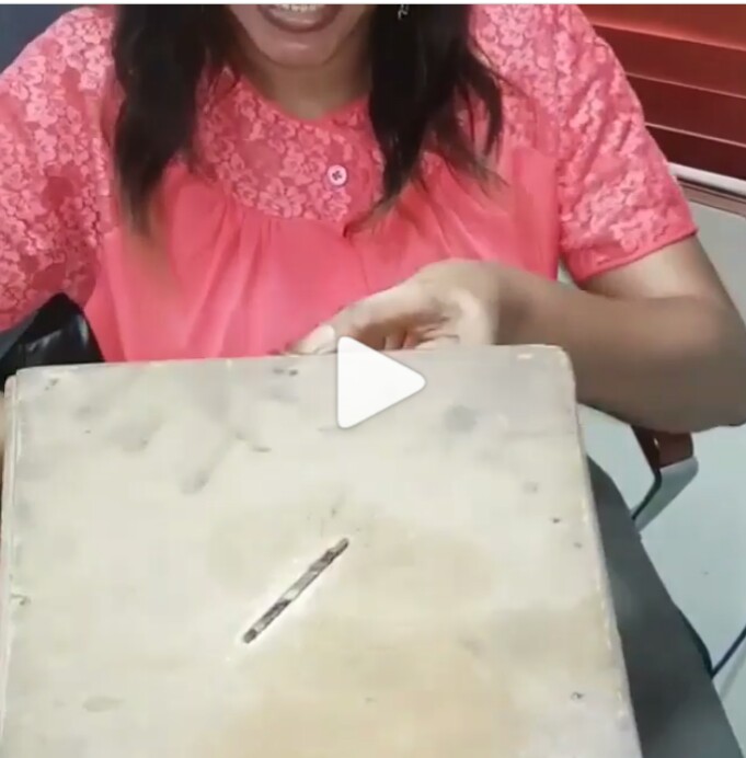 An excited Nigerian lady shows off all the money she saved in her piggy bank this year.