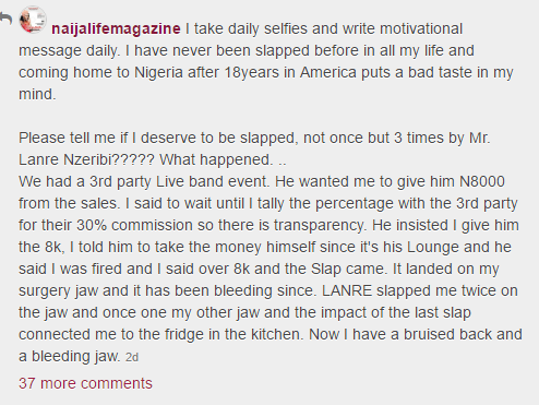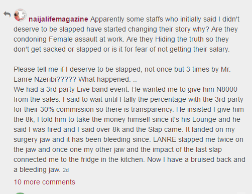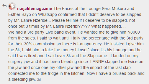 Linda Dominguez, lounge manager who accused Monalisa’s ex Lanre Nzeribe of slapping her three times over N8000 has shared pics of her injury.