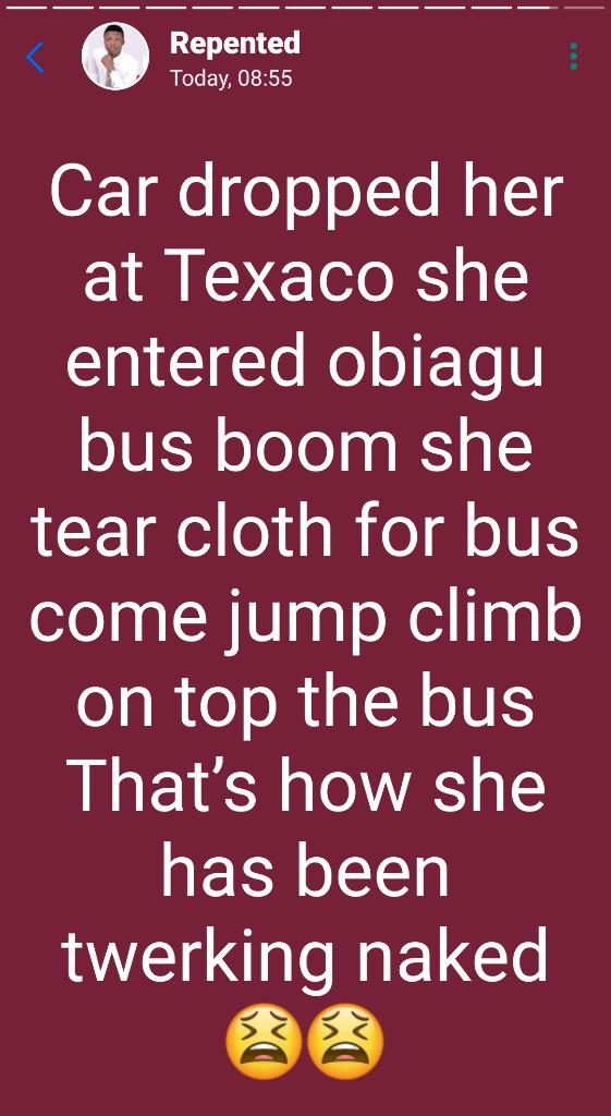 “Car dropped her at Texaco, she entered Obiagu bus, boom she tear cloth come jump climb on top the bus. That’s how she has been twerking nak*d