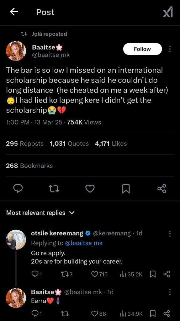 Expressing her frustration, she wrote: “The bar is so low. I missed out on an international scholarship because he said he couldn’t do long distance. (He cheated on me a week after) 🙂↕️ I even lied at home, saying I didn’t get the scholarship. 😭💔”