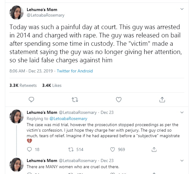 The Twitter user, @LetoabaRosemary said the victim of the false rape allegation was reportedly arrested in 2014 and has been prosecuted since then by the police.