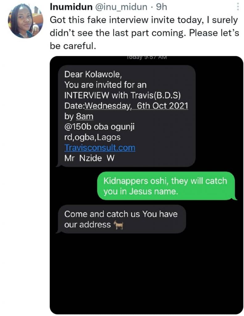 Inumidun @inu midun: “Got this fake interview invite today, I surely didn’t see the last part coming. Please let’s be careful.”