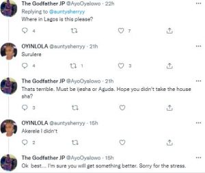 The lady identified as Oyinlola, who is house-hunting in Lagos disclosed that the apartment is located in Akerele, Surulere.