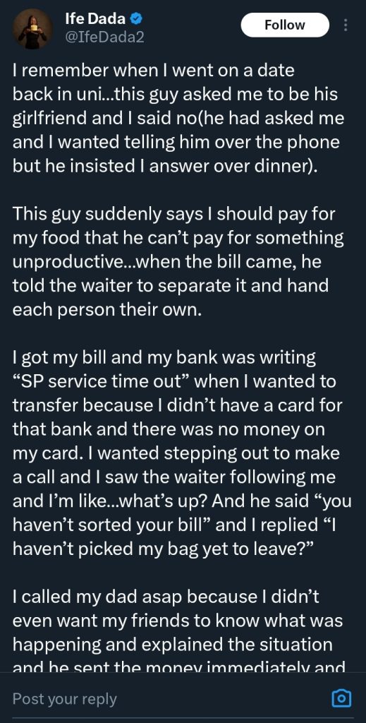 According to her account, the incident happened during her university days after agreeing to go on a dinner date with a male friend.