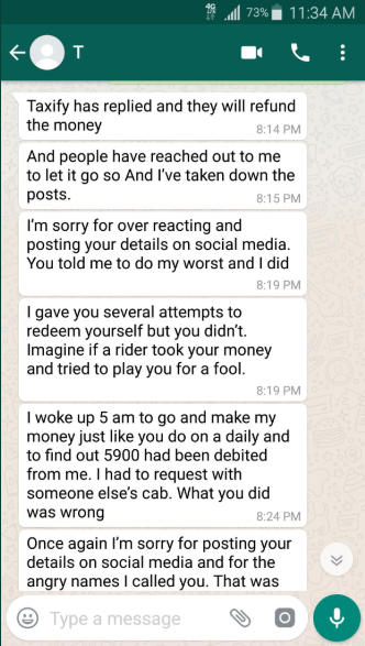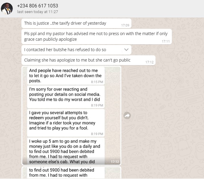 The lady named Agatha Grace accused Justice of fraud after she was charged 6,900 for a short trip from Aja to Lekki (read here ). Grace claimed Justice did not end the trip and continued to Surulere on her time. As a result, an exorbitant amount was deducted from her.