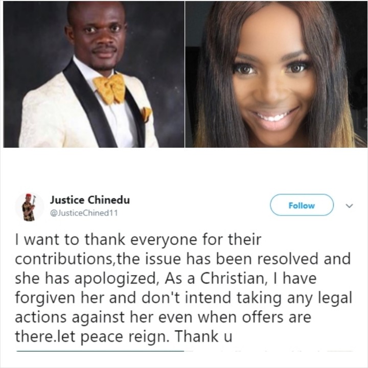 Justice said that he was letting it go and will not sue her anymore based on advice he received from his pastor and people around him.