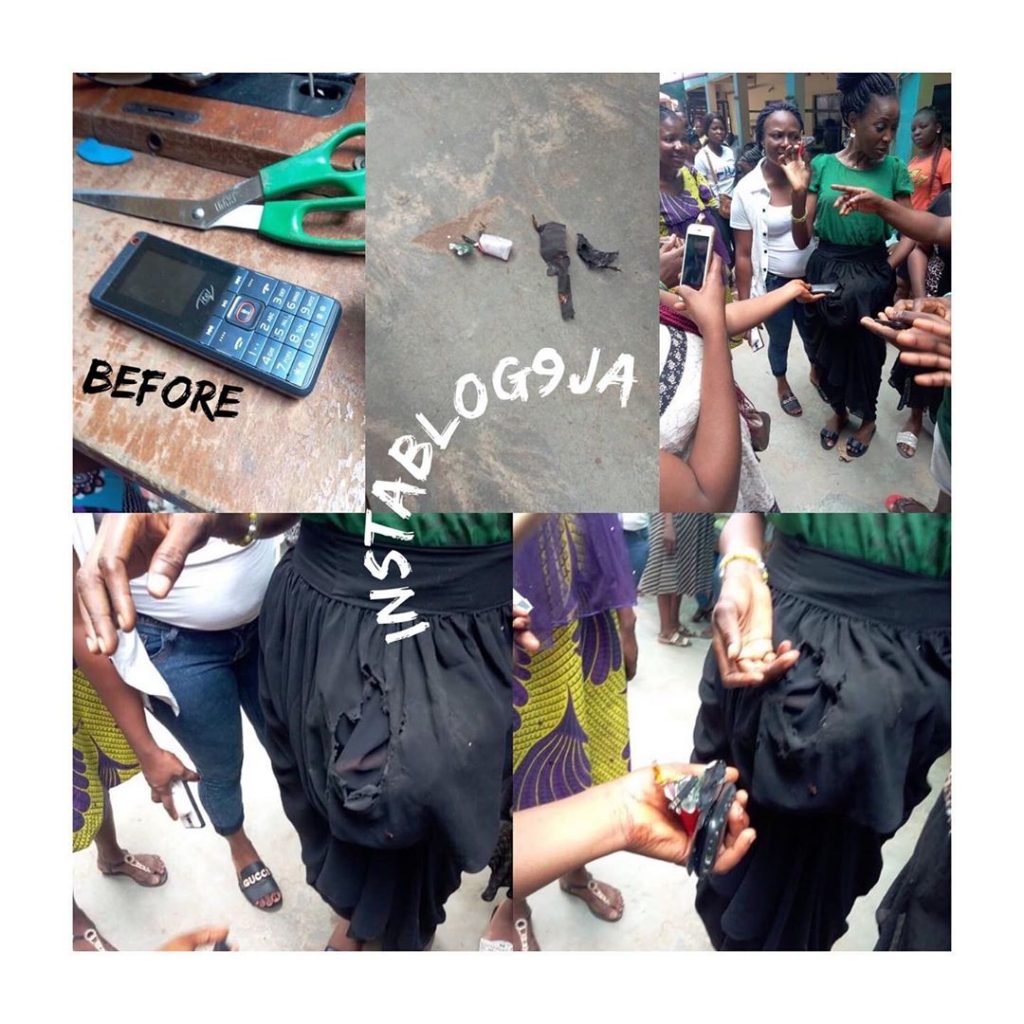 Lady’s skirt burnt after her phone exploded, today, at the New #Benin market, #Edo State
