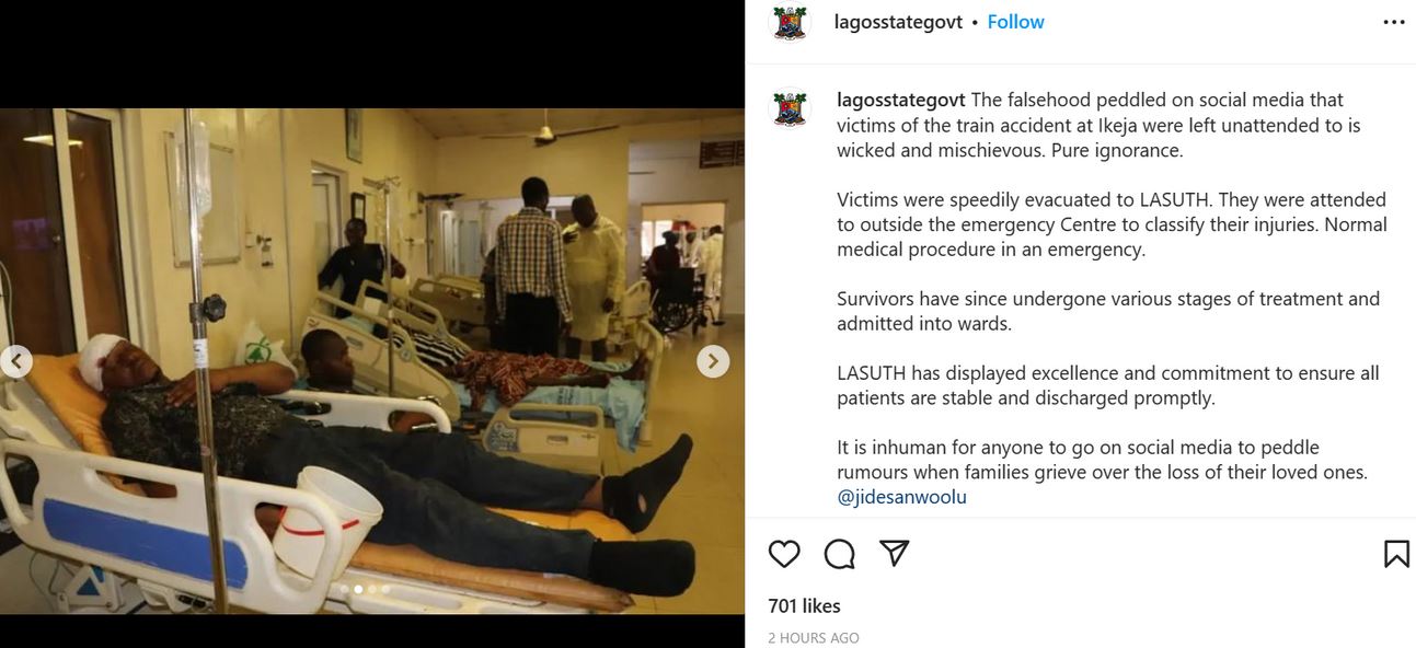 The Lagos state government has dismissed reports circulating on social media that it left the victims of the train accident at Ikeja unattended to.