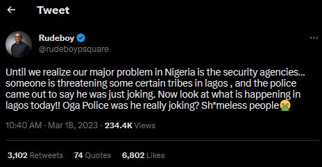 But Rudeboy who was angered by the response from police, took to his Twitter handle to lambast the police saying that security agency is the major problem in the country.