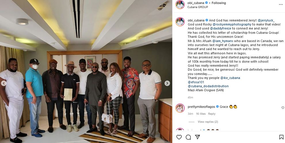 Obi Cubana, on his Instagram page, also revealed that one Mr & Mrs Afuah, based in Canada, has placed Ekuma on a N100,000 monthly salary till he finished his education.