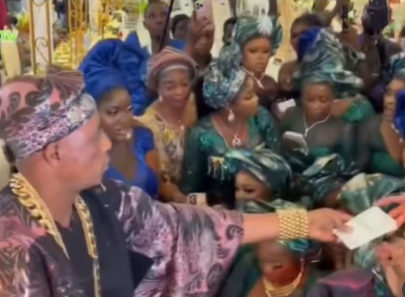 He took a moment at the wedding reception to handsomely reward the Aso Ebi girls that came to support his daughters. He doled out bundles of Naira notes to the ladies who were so excited as they received the cash.