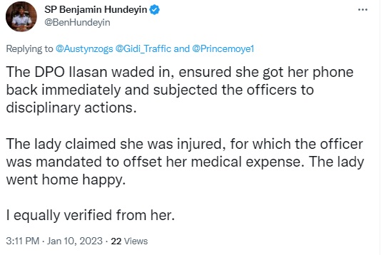 Reacting to the video, the spokesperson of the state police command, SP Benjamin Hundeyin, said the officers were made to face disciplinary action and the lady’s phone has been released to her.