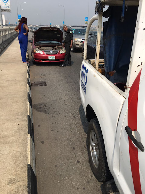 The lady’s car had broken down on Lekki Link Bridge. Lagos Rapid Response Squad immediately came to her rescue, helped her fix the car and gave her 5 liters of fuel for free to restart her car.