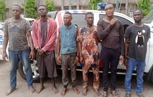 Tunde Azees 39yrs (M), Wasiu Animashaun 38yrs (M), Emmanuel Cletus 46yrs (M), John Mensah 24yrs (M), Lateef Gbolahan 37yrs (M) and Osas Ayo 34yrs (M), were all arrested under Marina Bridge towards Onikan Round-about on Lagos Island.
