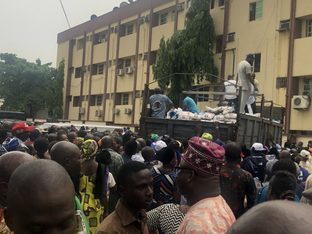 Members of the Lagos state civil service threw caution to the wind earlier today as they scampered for the bags of rice the APC governorship candidate in the state, Babajide Sanwo-Olu, sent to them as gifts.