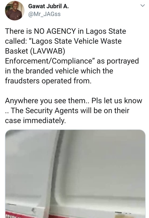 Bello affirmed that there is no unit or agency under the Ministry of the Environment and Water Resources that goes by the name “LAGOS STATE VEHICLE WASTE BASKET (LAVWAB) ENFORCEMENT/COMPLIANCE” as portrayed in the branded vehicle which the fraudsters operated from.