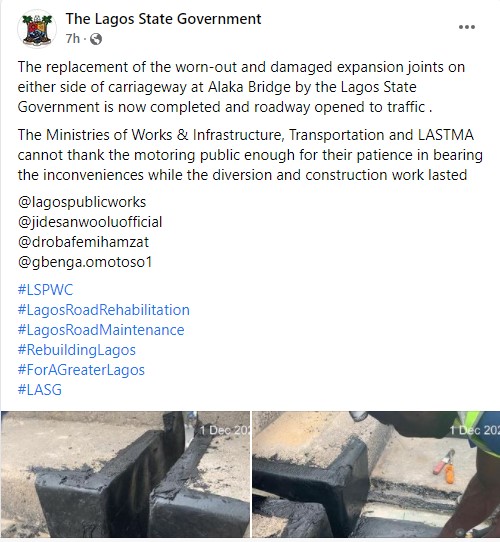 The replacement of the worn-out and damaged expansion joints on either side of carriageway at Alaka Bridge by the Lagos State Government is now completed and roadway opened to traffic .