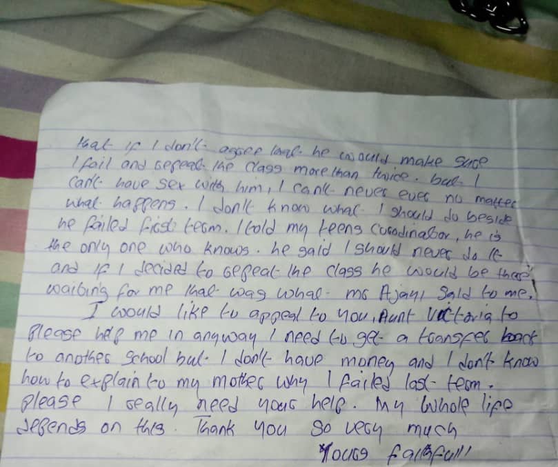 &”the students and teachers are scared to of.. Talkless of reporting him. kindly help out this young lady and many others from this sexual abuse