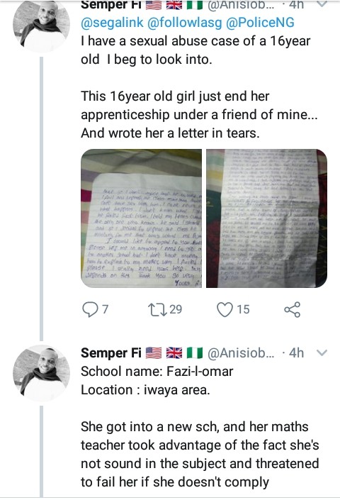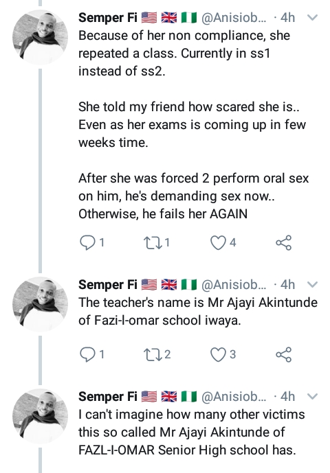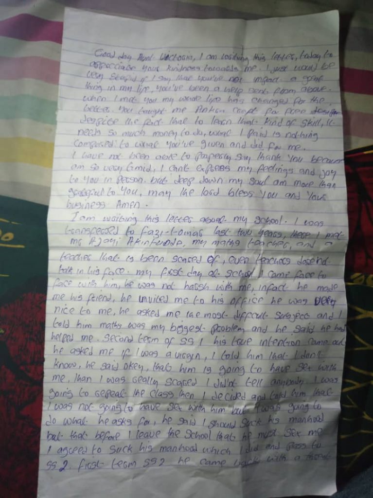 According to the girl she said ‘She got into a new sch, and her shameless maths teacher, Mr Ajayi Akintunfe took advantage of the fact she’s not sound in the subject and threatened to fail her if she doesn’t comply’