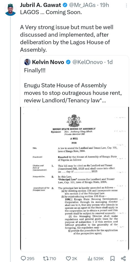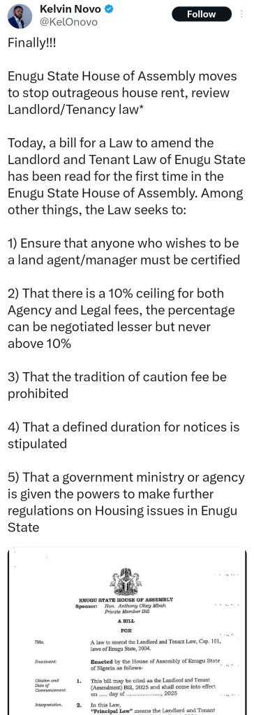 This comes as the Enugu State House of Assembly is considering a bill to regulate agency and legal fees for tenancy agreements, and to ban caution fees charged by landlords.