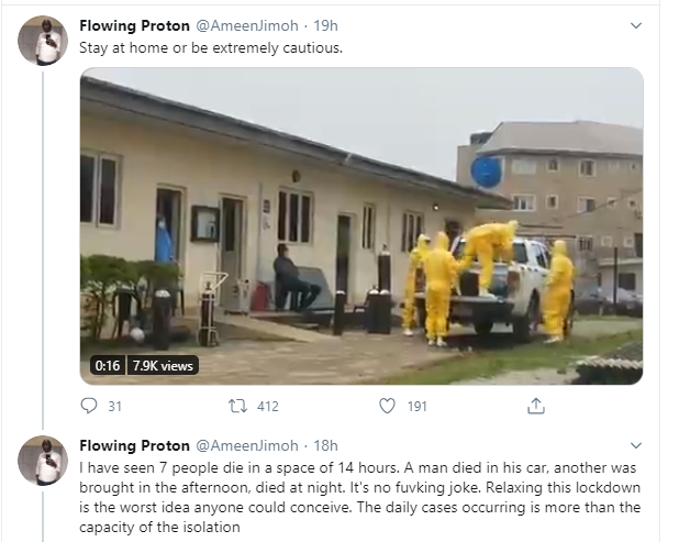 I have seen 7 people die in a space of 14 hours. A man died in his car, another was brought in the afternoon, died at night. It’s no fuvking joke. Relaxing this lockdown is the worst idea anyone could conceive. The daily cases occurring is more than the capacity of the isolation centres in Lagos combined.