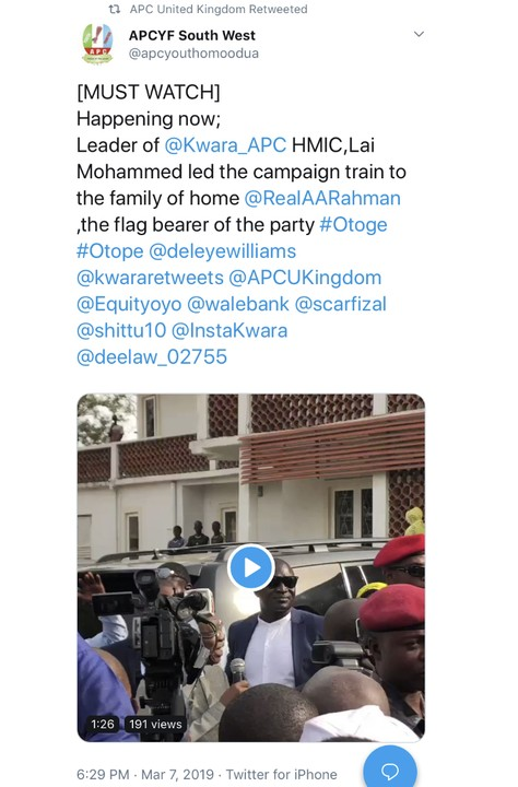 Here is the moment minister of information, Lai Mohammed led a campaign campaign train to the family of home Abdulrahman Abdulrazaq (APC governorship candidate Kwara state).
