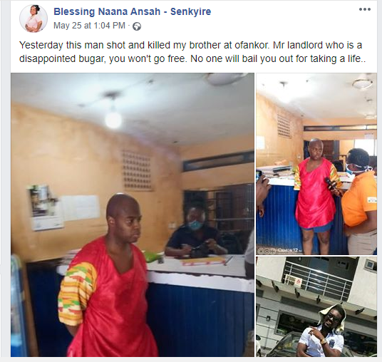 Facebook user, Blessing Naana Ansah-Senkyire shared photos of the arrested suspect at the police station. She revealed that the landlord who was angry that her brother, Kobby didn’t finish packing on the day he was asked to vacate the property, took a gun and shot him while still in his room. Kobby reportedly died instantly.