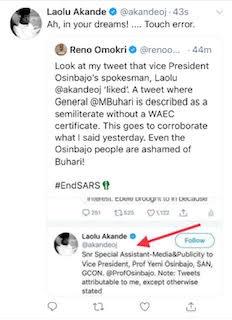 On Friday October 23, 2020, vice President Yemi Osinbajo’s spokesman, Laolu Akande ‘liked’ a tweet made by author Reno Omokri, where General Buhari is described as a semiliterate without a WAEC certificate.