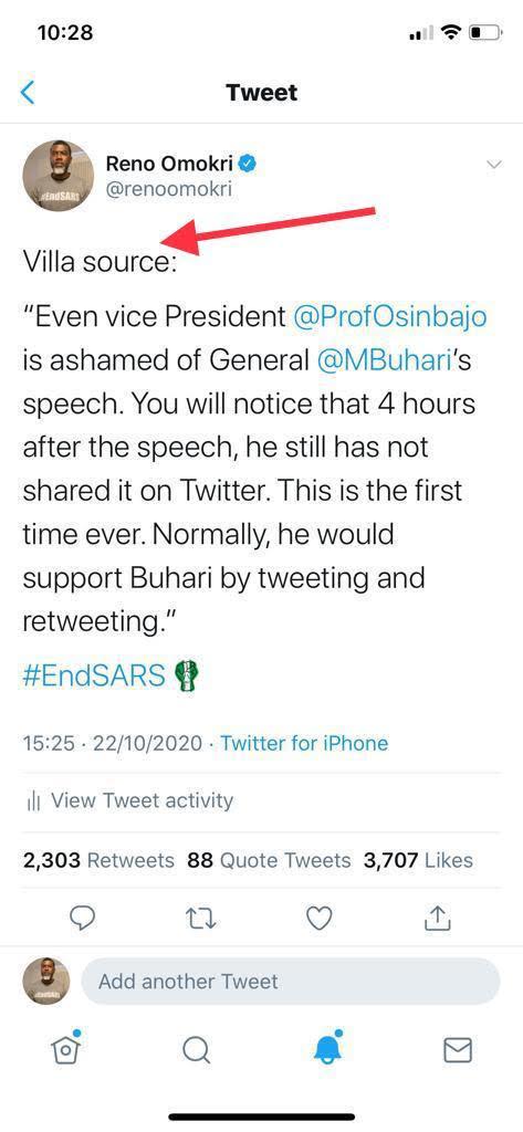 “A Villa source told me that Osinbajo was ashamed of Buhari’s broadcast. That is why he refused to retweet it or share it on social media as was his previous usual practice. Even the Osinbajo people are ashamed of Buhari!”