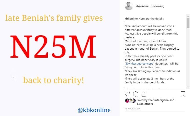 Owner of KBK online, a Non-Governmental Organization that helped raise money for baby Beiah, just gave an update on his IG page. He wrote