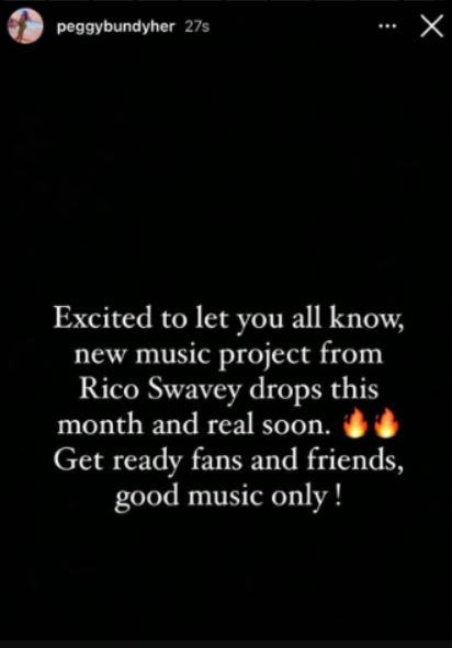 “Excited to let you all know, new music project from Rico Swavey drops this month and real soon. Get ready fans and friends, good music only!” she wrote via her Instastory.
