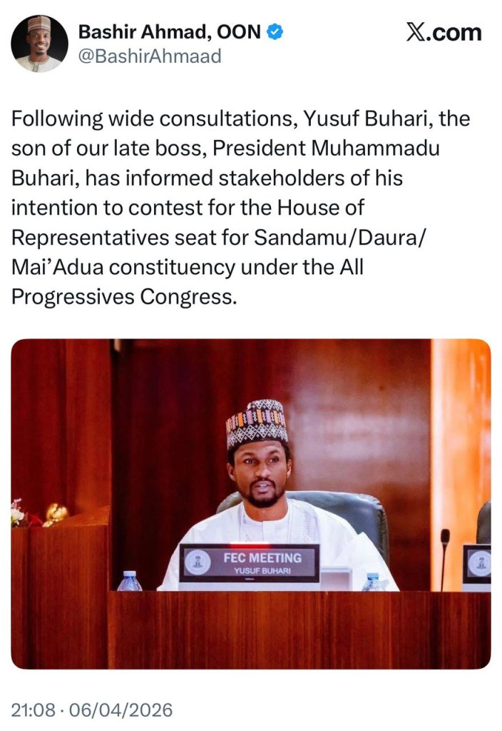 ‘’Following wide consultations, Yusuf Buhari, the son of our late boss, President Muhammadu Buhari, has informed stakeholders of his intention to contest for the House of Representatives seat for Sandamu/Daura/Mai’Adua constituency under the All Progressives Congress.”