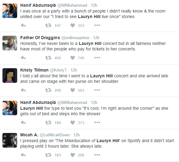“My driver got lost — I can’t control that.”A social media debate unfolded over whether or not it was fair to expect professionalism and punctuality from the Jersey-born Grammy winner. Back at a London concert in 2014, social media lit up with complaints that Lauryn showed up 90 minutes late and delivered an “utter sh–e” performance.