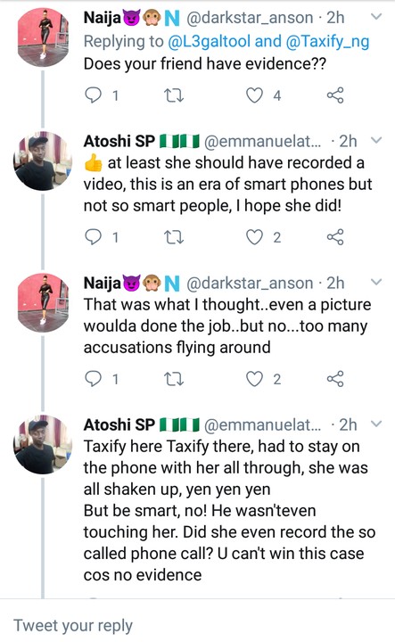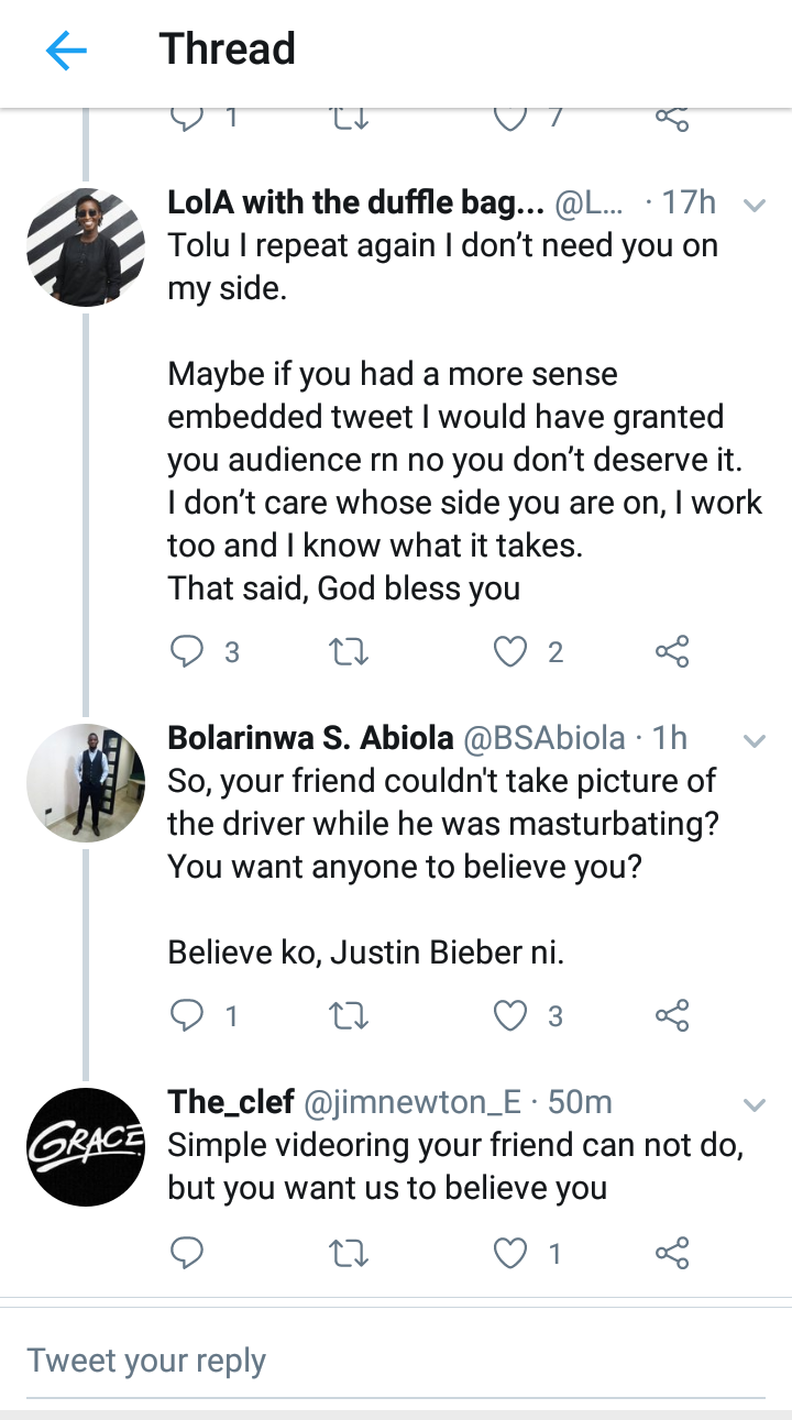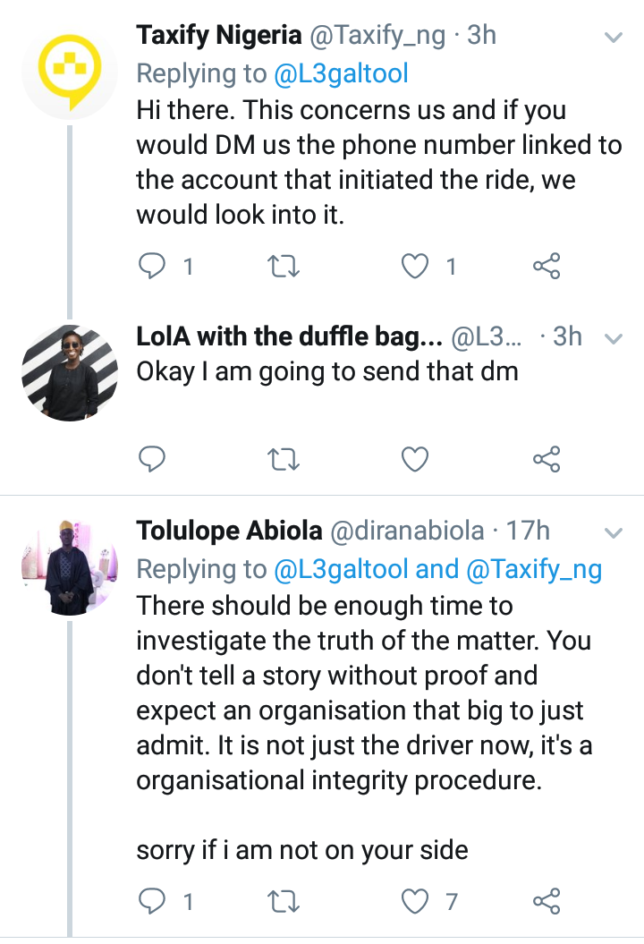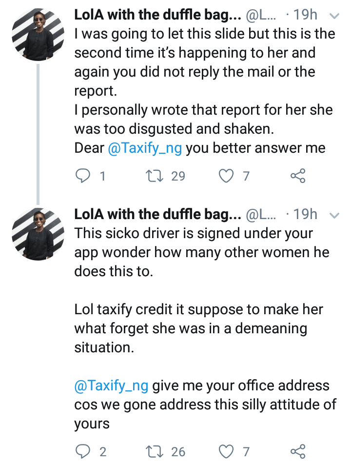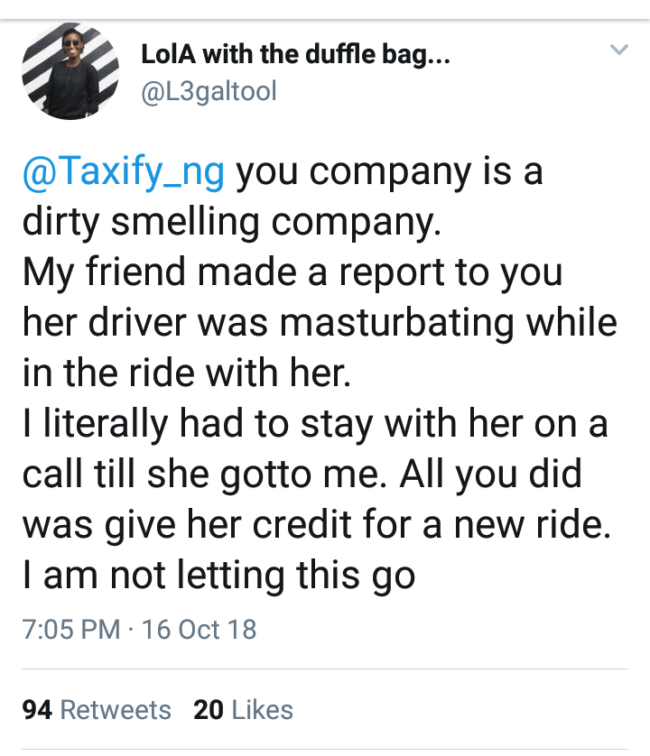 An entertainment lawyer, Omolola Oyedele took to Twitter to call out transport company, Taxify alleging that one of their drivers was masturbating while he drove her friend.