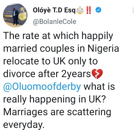 “The rate at which happily married couples in Nigeria relocate to UK only to divorce after 2years. @Oluomoofderby, what is really happening in UK? Marriages are scattering everyday,” the lawyer tweeted on Saturday