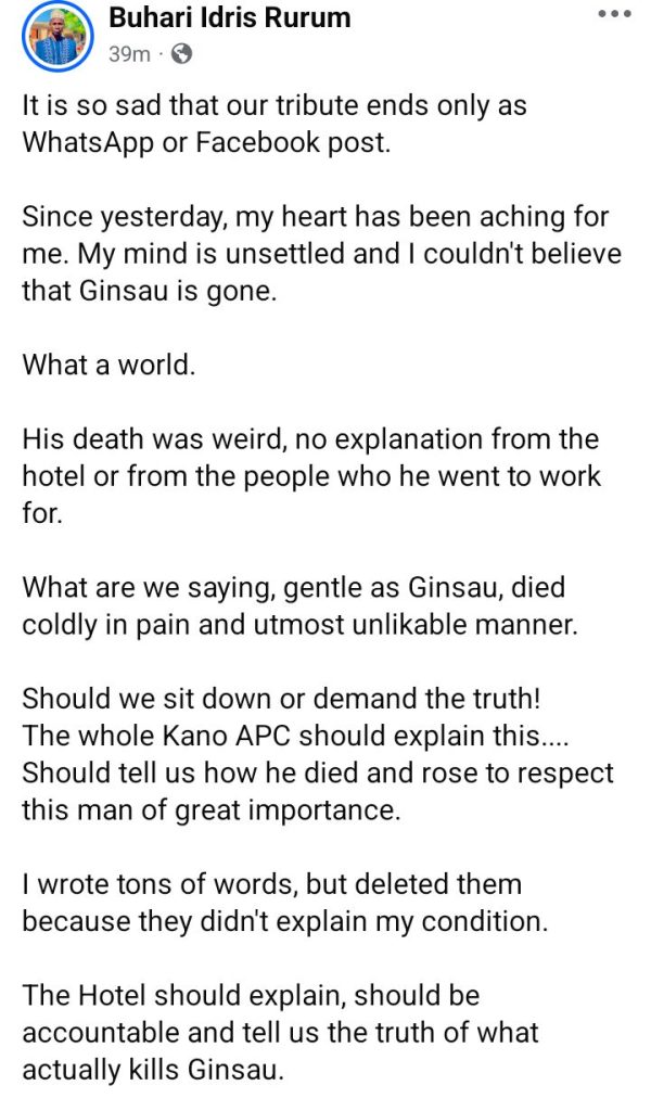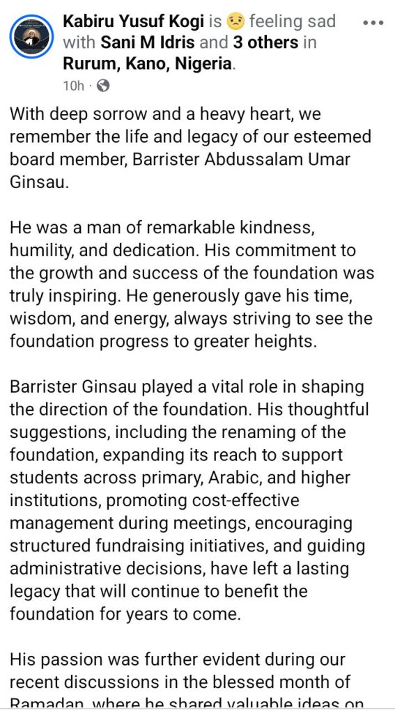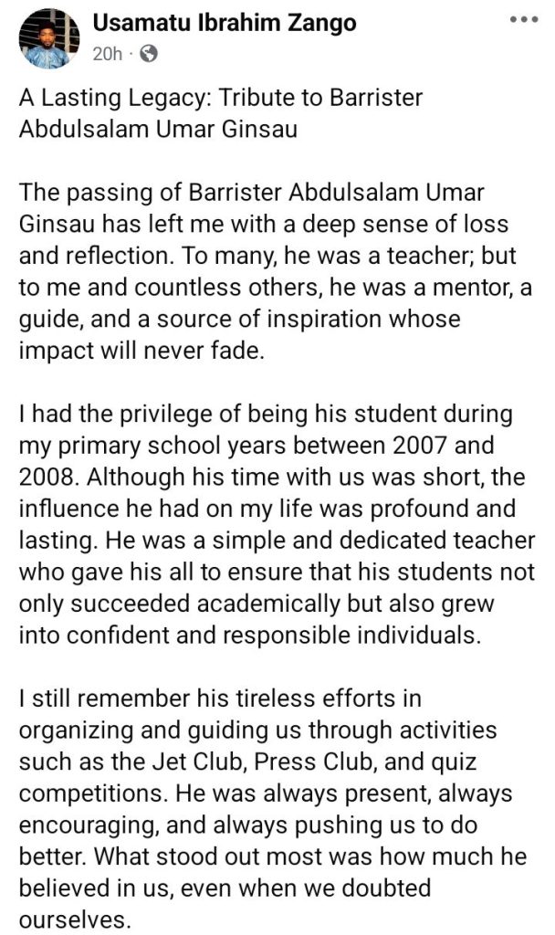 “The passing of Barrister Abdulsalam Umar Ginsau has left me with a deep sense of loss and reflection,” one Usamatu Zango, wrote.